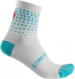 De beste fietssokken voor dames zijn van het merk Castelli. Deze Castelli Puntini fietssokken zijn halfhoog, hebben een wit met blauwe kleur en zijn in meerdere maten te bestellen.