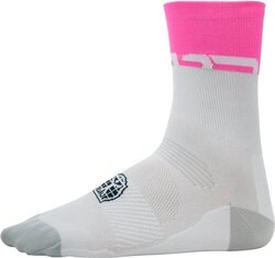 Fietssokken met een vrolijke zomerse uitstraling, zijn ook deze van Bioracer. De sokken zijn wit van kleur en hebben een knalroze rand aan de bovenkant. Ze zijn gemaakt van elastaan in combinatie met lycra stof.